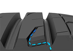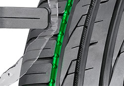 Брекерный слой выполнен из прочной и одновременно легкой стальной проволоки, которая придает всей конструкции жесткость необходимую для точного маневрирования и первоклассной управляемости. Усиленный брекер придает шине устойчивость и выносливость даже в условиях повышенных нагрузок, а также способность лучше противостоять проколам, порезам и другим механическим повреждениям с которыми можно столкнуться на плохих дорогах.